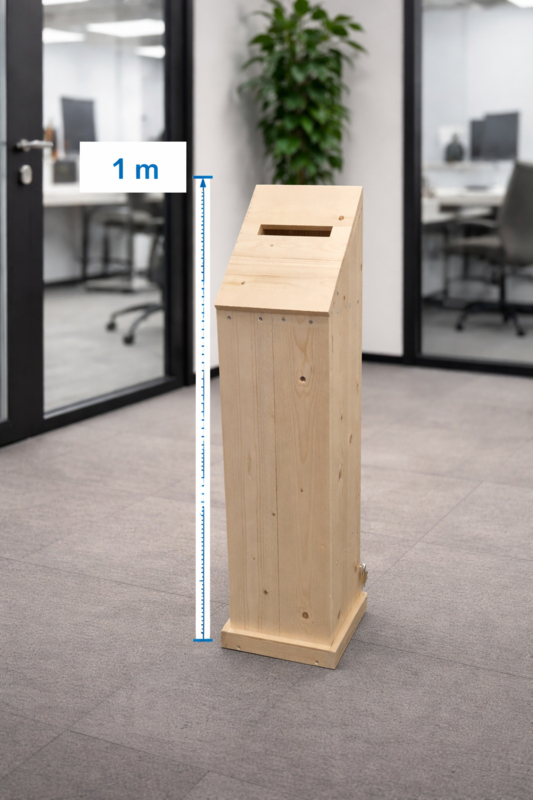 Geef ideeën en feedback een stijlvolle plek met deze houten ideeënbus in zuilvorm. Met een hoogte van 100 cm en een robuuste uitstraling is dit een opvallende en functionele toevoeging aan elke ruimte.